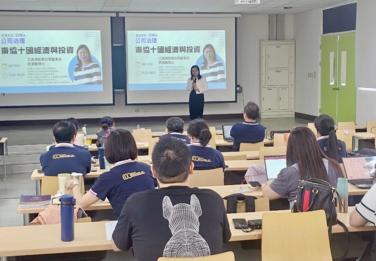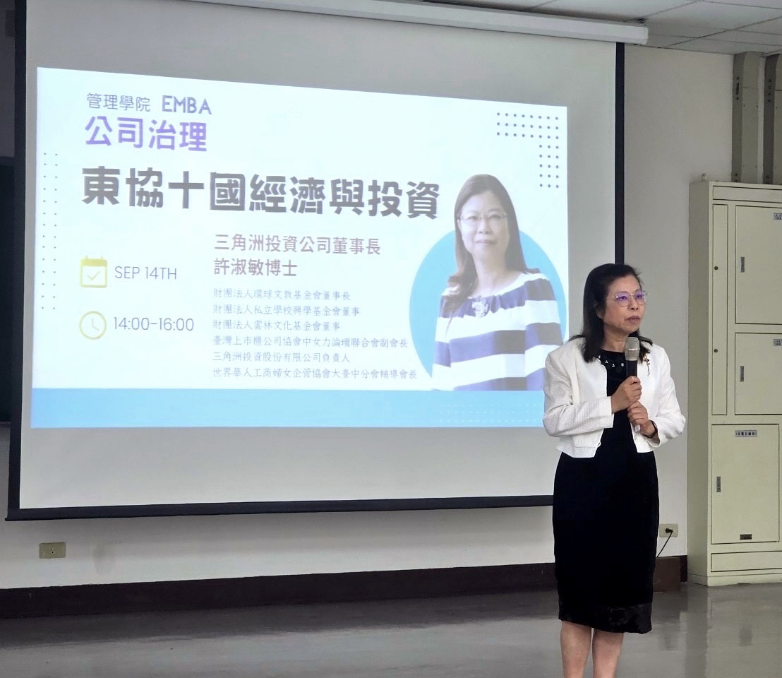 113.09.14公司治理」EMBA研一研二學弟妹與學長姊開學首堂課大來賓,邀請許淑敏博士,進行專題講座:「東協十國經濟與投資」,帶領同學更深入跨國投資環境思維,內容相當精采。