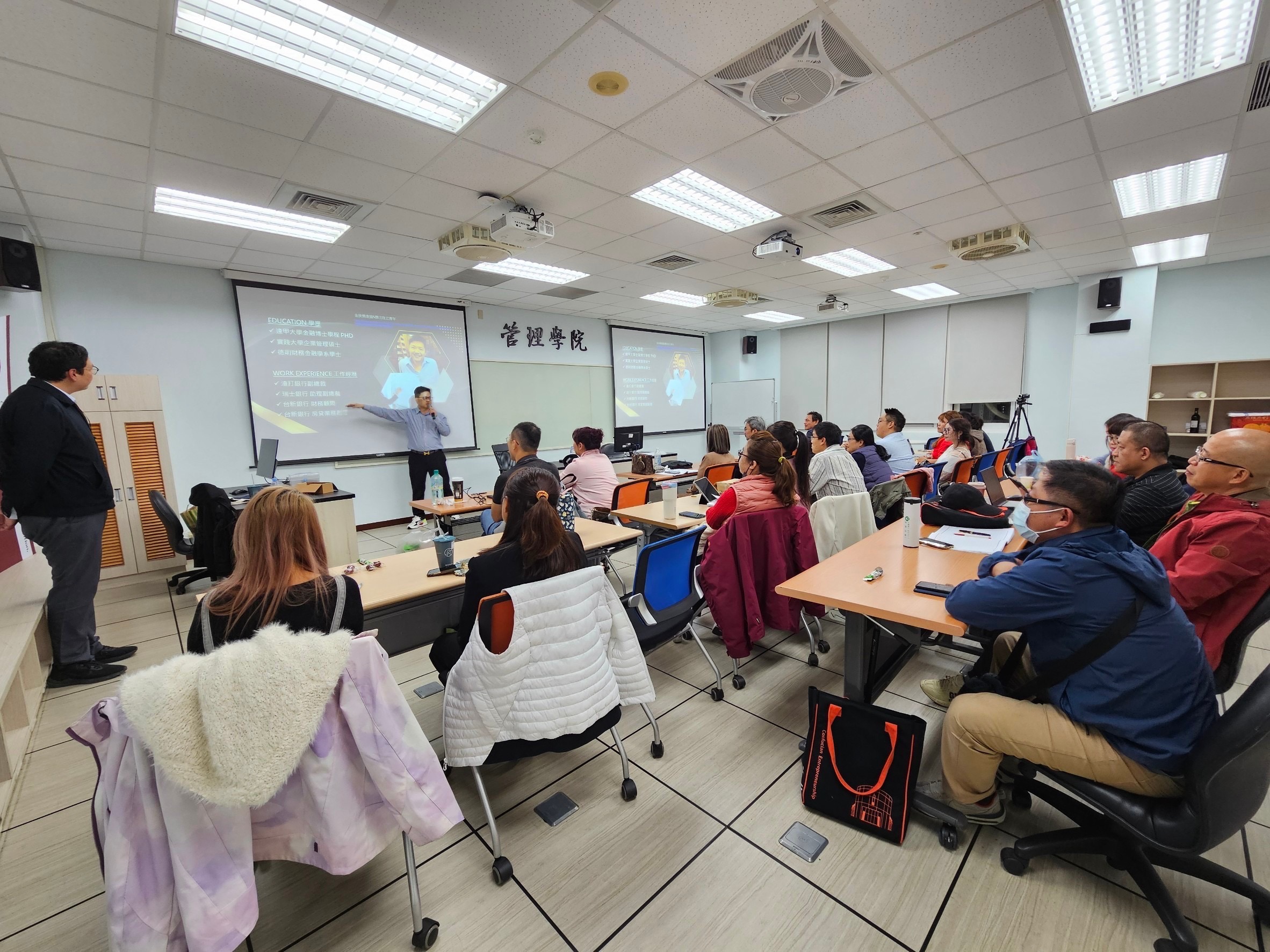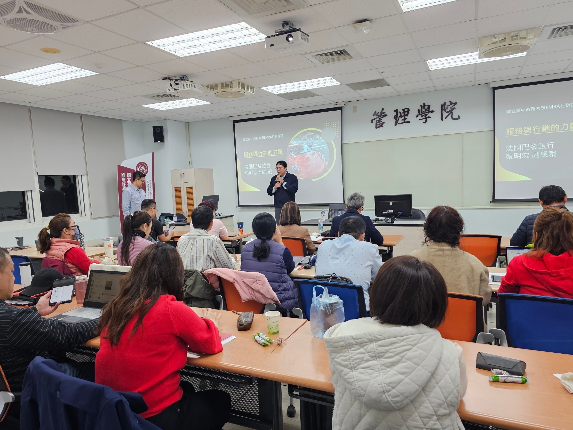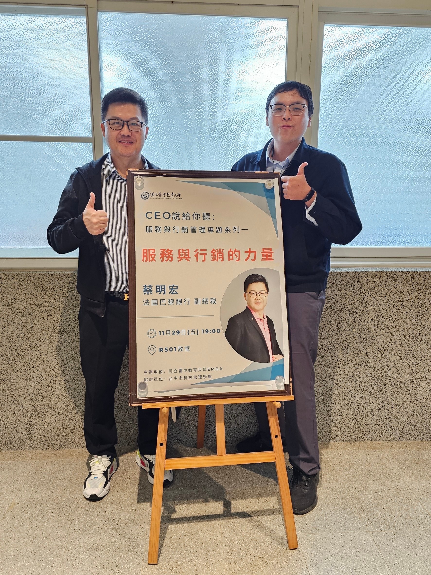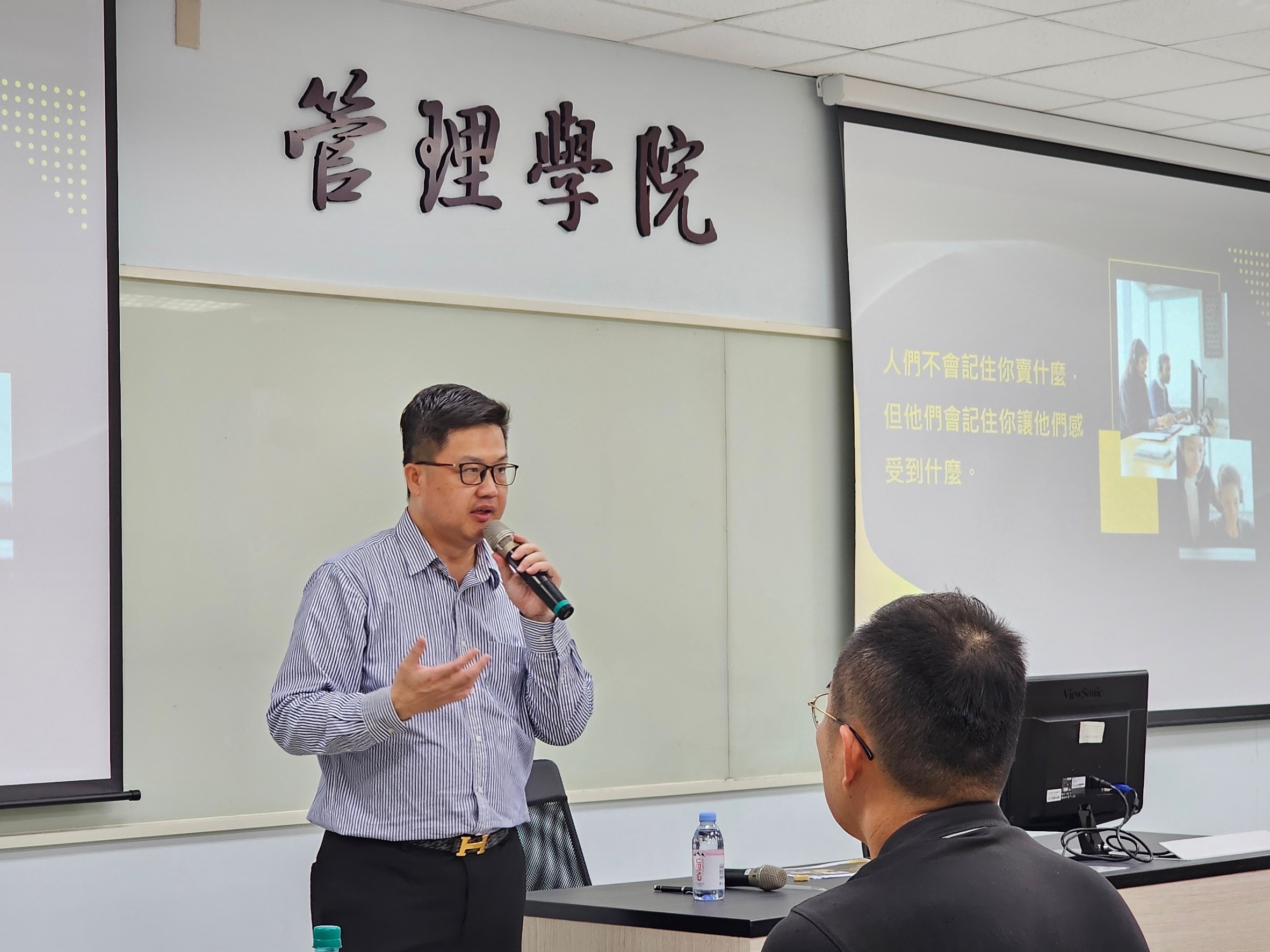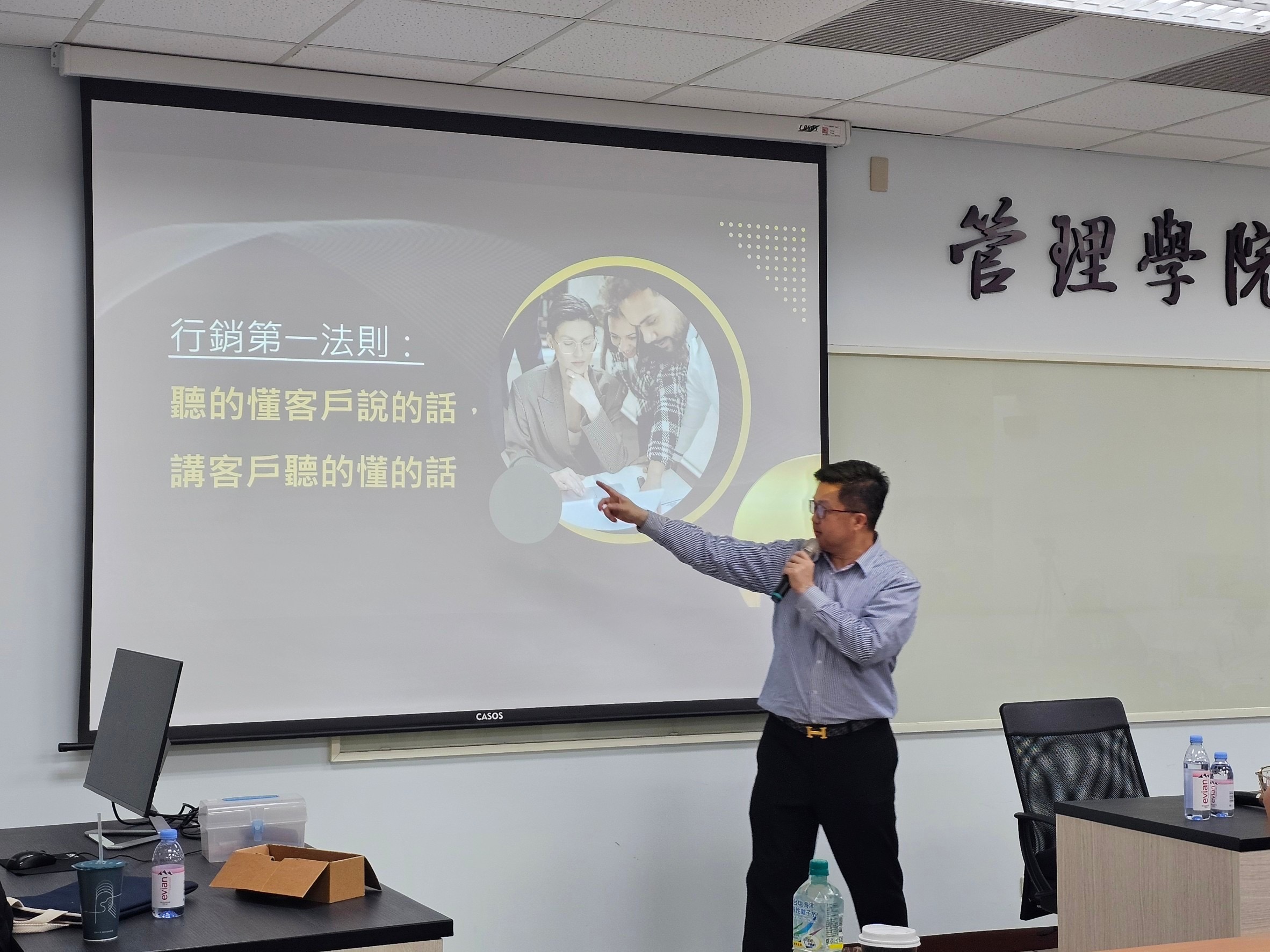 113.11.30王健航老師邀請法國巴黎銀行蔡明宏副總裁進行專題講座「服務與行銷的力量」,以他自身的故事開始分享行銷,從他小時候被扶養到工作經歷,把自己做為產品進行行銷。分享行銷法則「聽的懂客戶說的話,講客戶聽的懂的話」,服務和行銷不要怕多做,但要自然真誠不刻意,要站在客人的立場,客人的信任才是重點...